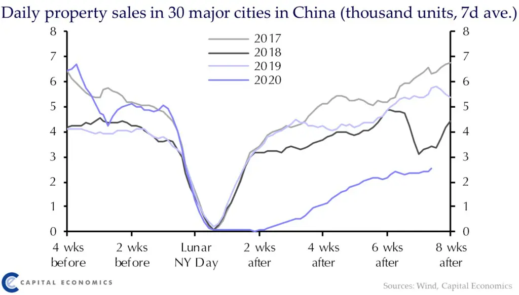 De onderstaande grafiek toont vastgoedtransacties in China vanaf het eerste stadium van de uitbraak. Transacties daalden aanzienlijk – bijna 100 procent – gedurende een aantal weken tijdens de crisis, maar groeien nu weer.