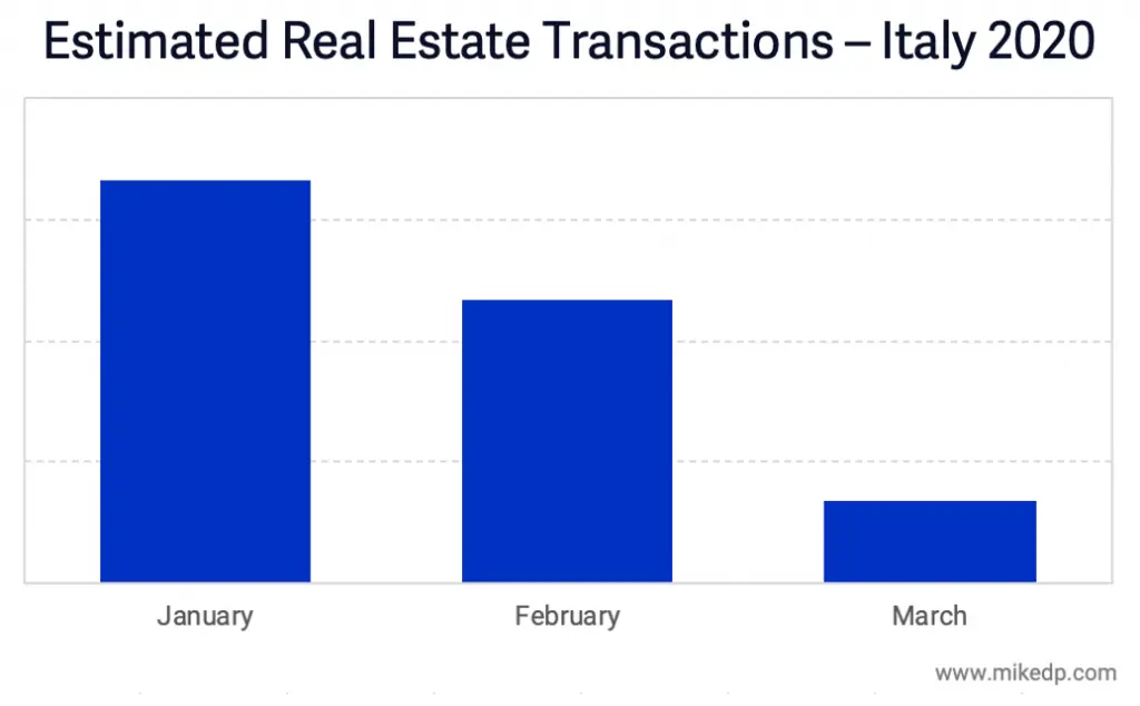 Italië toont een vergelijkbaar verloop: een grote woningwebsite uit Italië verwacht dat de transactievolumes met 20-40 procent zijn gedaald in februari en 70-90 procent in maart. Een andere bron citeert dat het aantal zoekopdrachten naar appartementen dat vanaf begin maart te koop staat met meer dan 50 procent is gedaald ten opzichte van een jaar geleden.
